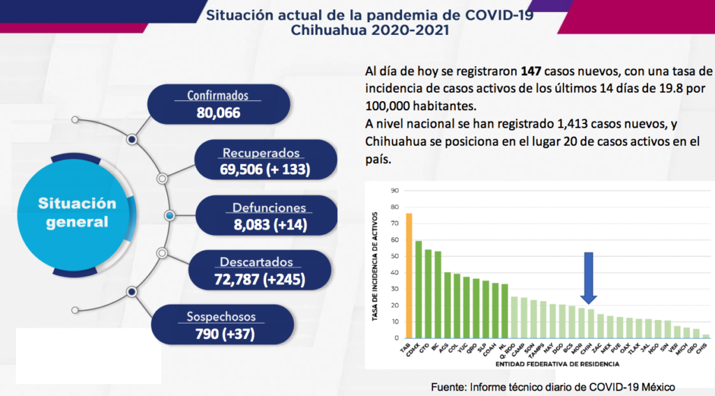 El Gobierno del Estado, a través de la Secretaría de Salud de Chihuahua, presenta este 20 de octubre el reporte COVID-19, en el cual se registran 80 mil, 066 (+147) personas confirmadas en la entidad por este padecimiento, 69 mil 506 (+133) casos recuperados, 72 mil 787 (+245) descartados y 790 (+37) casos sospechosos.