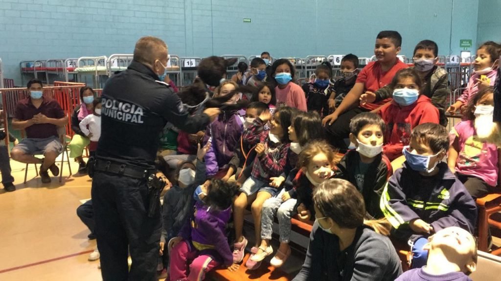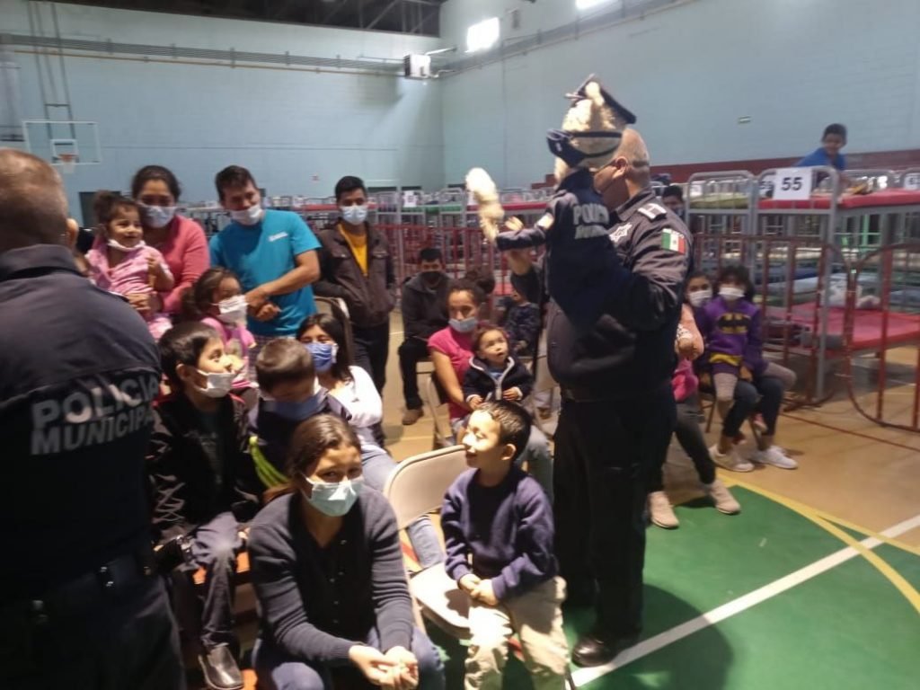 Elementos adscritos al Grupo 16 de la Policía Municipal, llevaron temas preventivos en el gimnasio “Kiki Romero”, el cual se encuentra habilitado como albergue para migrantes, a través de una función del teatrino.