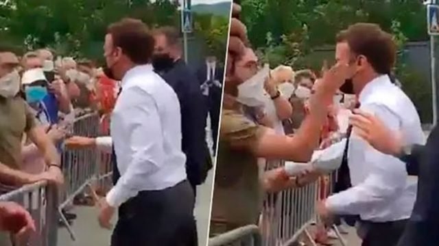 Un video publicado por el canal de noticias BFM TV mostró cuando Macron caminaba hacia una multitud que lo vitoreaba y saludaba a un hombre, quien en ese momento lo abofeteó.