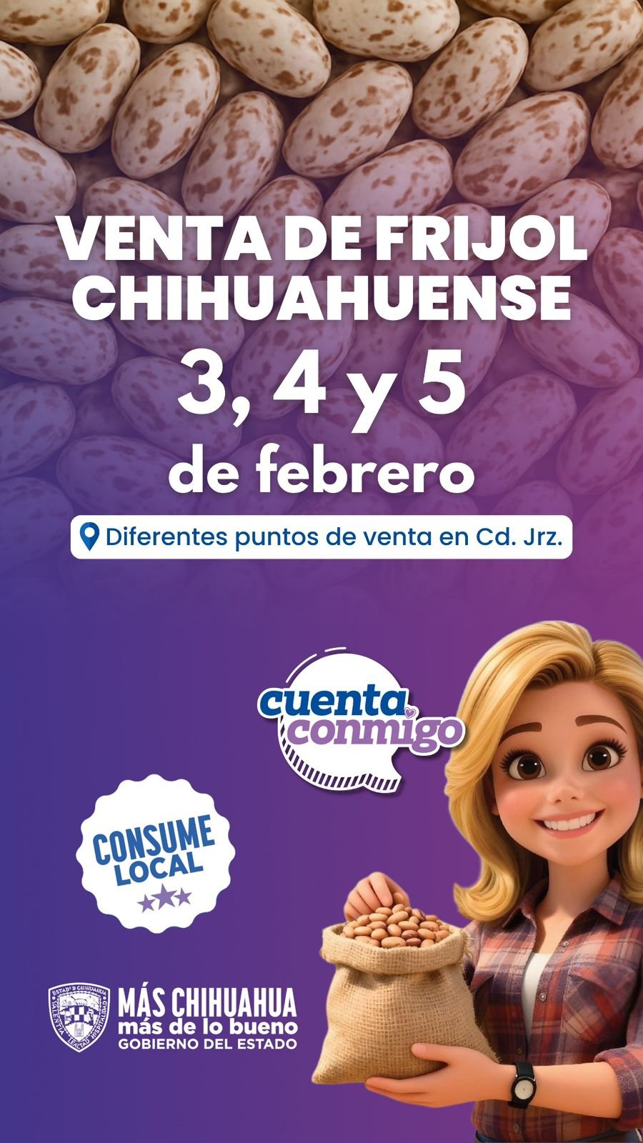 El Gobierno del Estado, a través de la Secretaría de Desarrollo Rural (SDR), invita a las y los juarenses a participar en la “Venta de Frijol Chihuahuense”, del 3 al 5 de febrero, en distintos puntos de la ciudad, con el fin de impulsar el consumo de productos locales y fortalecer la economía del sector rural.