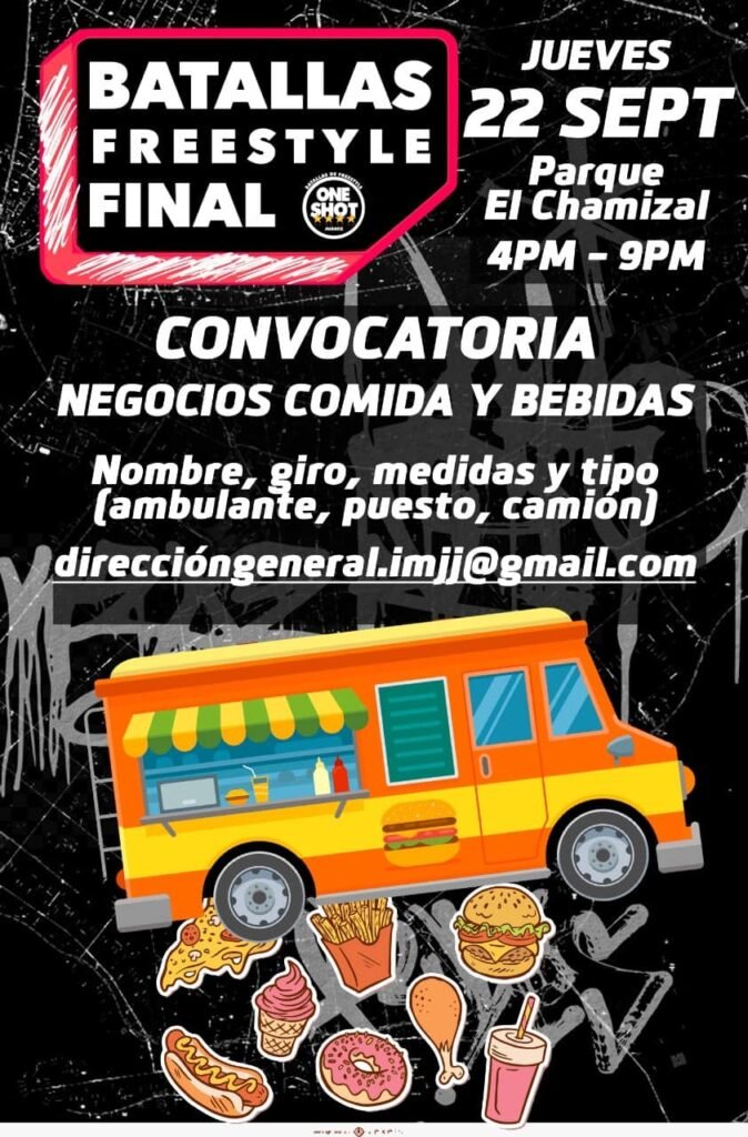 El Instituto Municipal de la Juventud Juarense (IMJJ) invita a los propietarios de restaurantes y puestos de comida para que participen en el concurso final de Batallas de Freestyle, evento que se efectuará el próximo jueves 22 de septiembre en el parque El Chamizal.