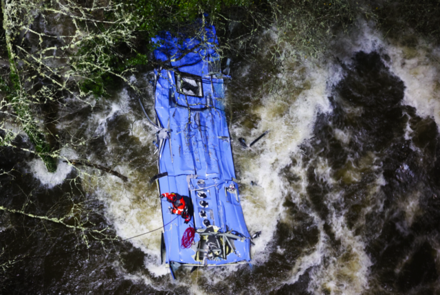 Los rescatistas y los policías locales pasaron la noche buscando a las personas desaparecidas en el siniestro, pero el operativo de búsqueda se suspendió ante la imposibilidad de acceder al interior del vehículo, que se encontraba metido en el río, indicó.