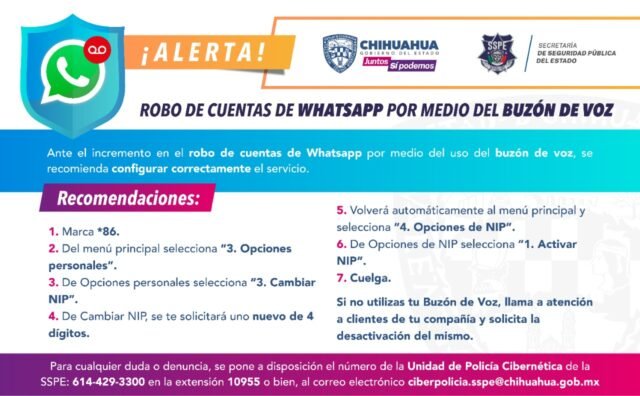 La Secretaría de Seguridad Pública del Estado (SSPE), a través de su Unidad de Policía Cibernética, alertó los usuarios Whatsapp sobre el robo de cuentas a través del uso del buzón de voz.
