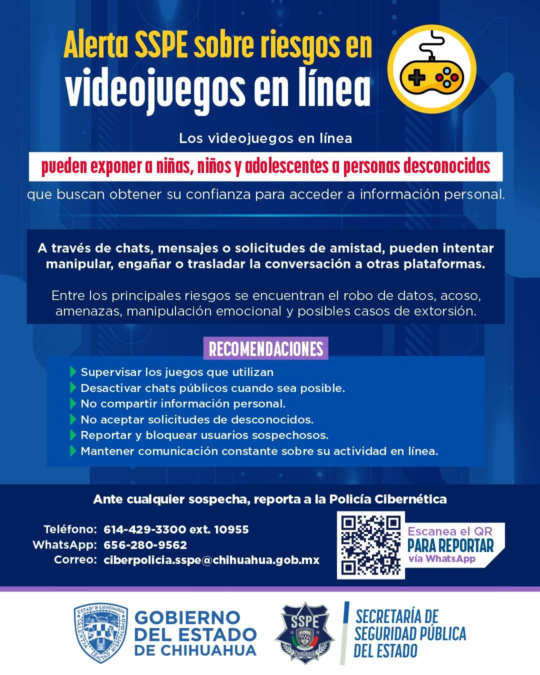 La Secretaría de Seguridad Pública del Estado (SSPE) alerta a madres, padres y tutores sobre los riesgos asociados al uso de videojuegos en línea, donde personas desconocidas pueden interactuar con niñas, niños y adolescentes mediante chats de voz, mensajes y solicitudes de amistad.