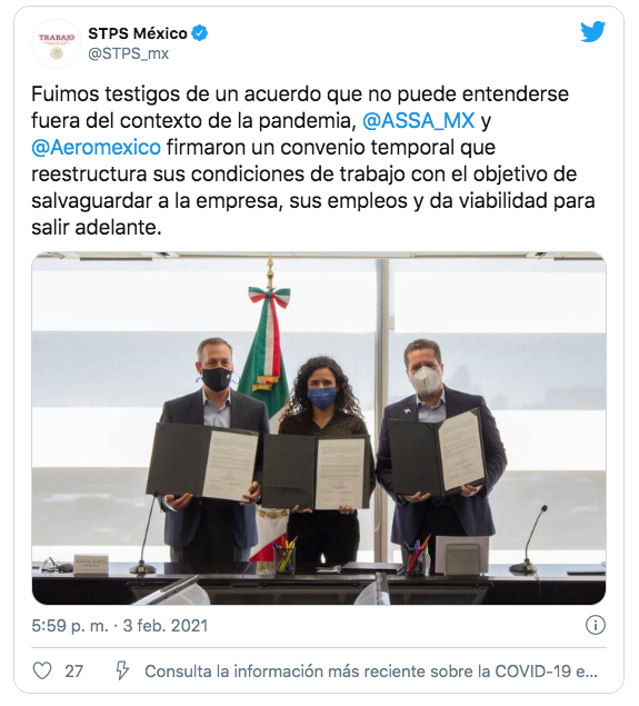 La Secretaría del Trabajo y Previsión Social informó que se logró un acuerdo de reestructuración temporal entre la Asociación Sindical de Sobrecargos de Aviación (ASSA) y Aeroméxico, que protege los empleos de sobrecargos y salvaguarda a la empresa.