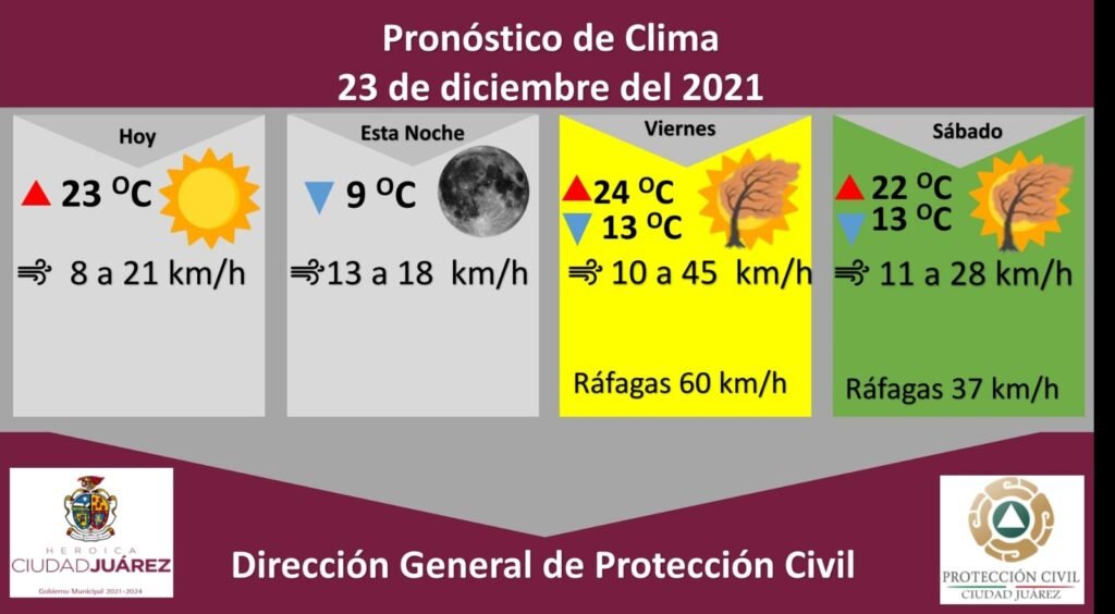 Para hoy se espera una temperatura de 23°C con vientos de 8 a 21 kilómetros por hora, mientras que la mínima será de 9°C con vientos de 13 a 18 kilómetros por hora.