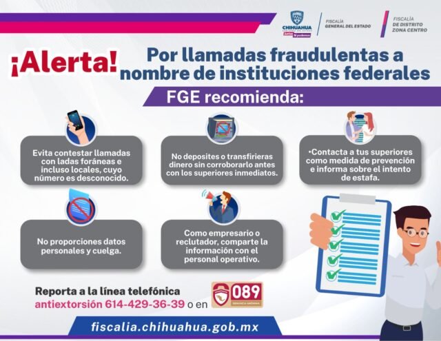 La Fiscalía de Distrito Zona Centro emitió una alerta a fin de que la ciudadanía evite ser víctima de fraude cometido vía telefónica, en el que solicitan depósitos o transferencias de dinero con el engaño de aplicarles multas por falta de pago de derechos o incumplimiento de obligaciones.