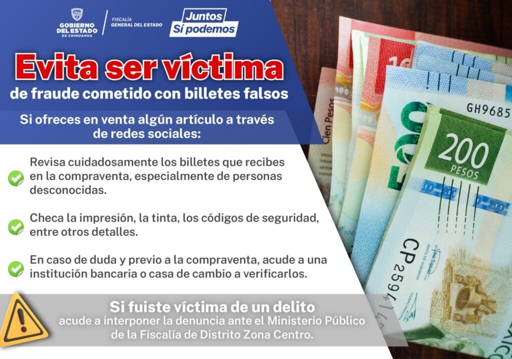 La Unidad de Investigación y Persecución del Delito de la Fiscalía de Distrito zona Centro en el municipio de Delicias, alerta a la ciudadanía ante fraudes cometidos por sujetos que pagan con billetes falsos a las víctimas que ofrecen artículos a través de las redes sociales.