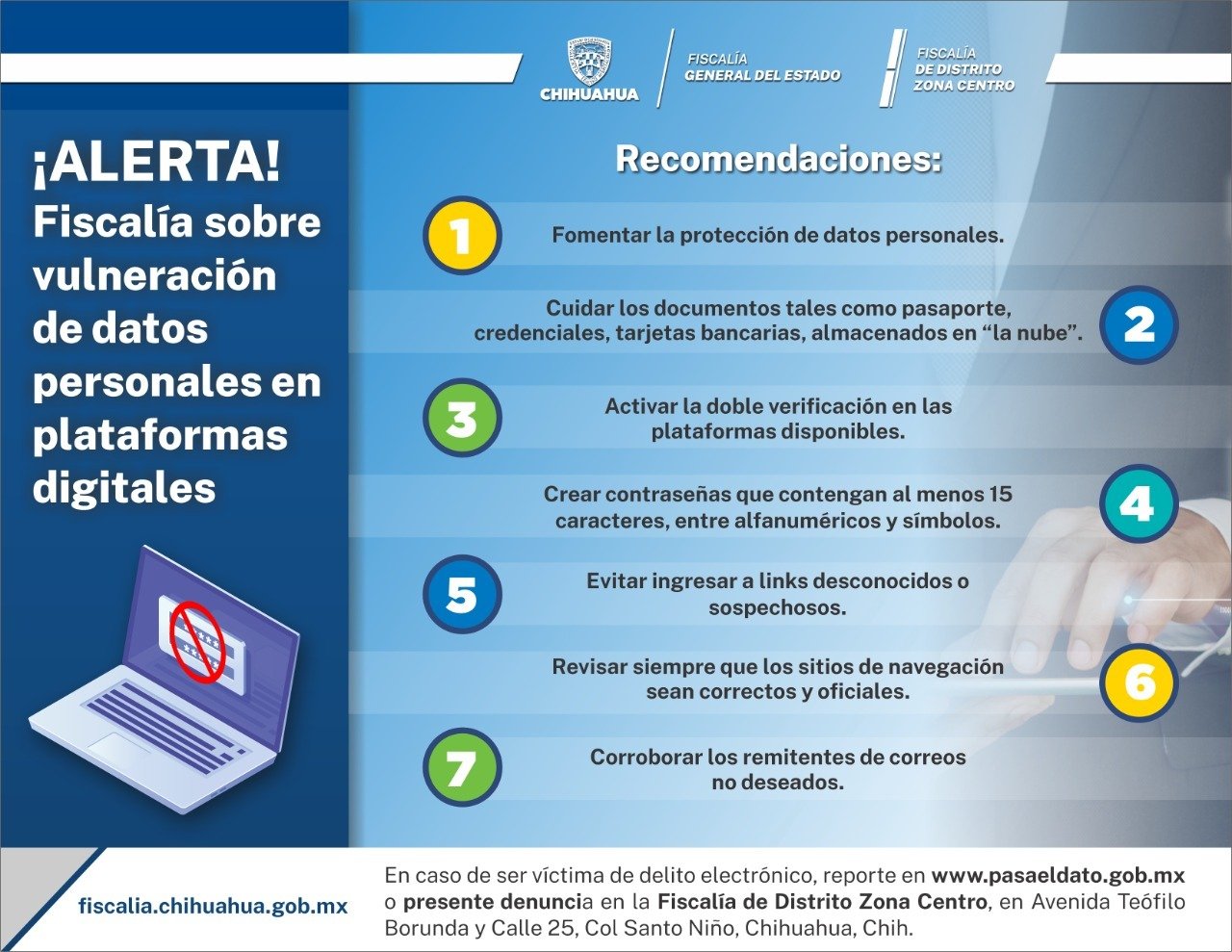 En caso de ser víctima de algún delito electrónico, reportarlo en la página www.pasaeldato.gob.mx o presentar la denuncia en la Fiscalía de Distrito Zona Centro, en la Avenida Teófilo Borunda y Calle 25. Col Santo Niño, ciudad de Chihuahua.