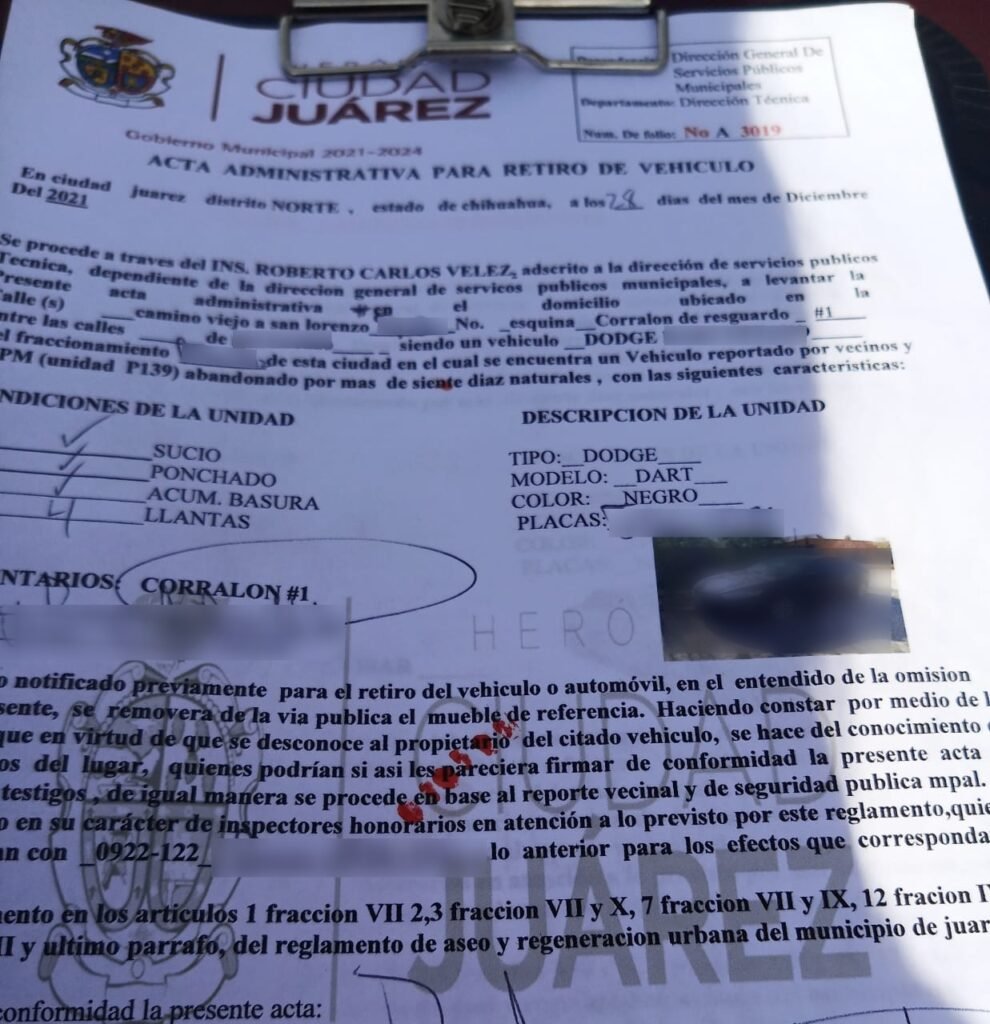 Indicó que han recibido quejas de varias personas, quienes les informan que en algunos sectores de la ciudad han acudido gentes que presentan oficios que presuntamente son de Servicios Públicos Municipales, y con ello pretenden retirar los automóviles de los domicilios particulares.