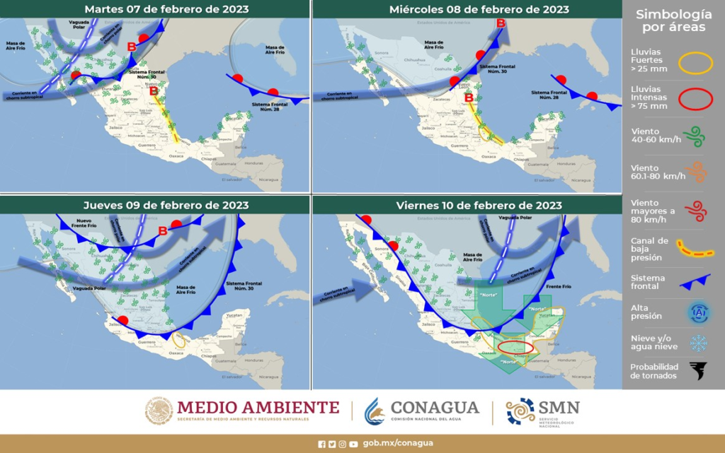 La dependencia estatal indicó que con base en la información emitida por el Servicio Meteorológico Nacional el ingreso del Frente Frío Número 30, en interacción con una corriente en chorro y una masa de aire frío, dejará un ambiente muy frío desde el amanecer del miércoles y hasta el viernes 10 de febrero.