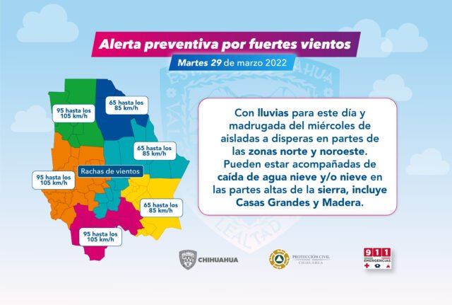 Indicó que para las 12:00 habrá rachas superiores a 80 km/h en gran parte de la región occidental de la entidad, con puntuales superiores a 100 km/h en zonas de Namiquipa, serranía de Chihuahua, Riva Palacio, Gómez Farías, Ignacio Zaragoza, Nonoava, Carichí y San Francisco de Borja y en la sierra Tarahumara.