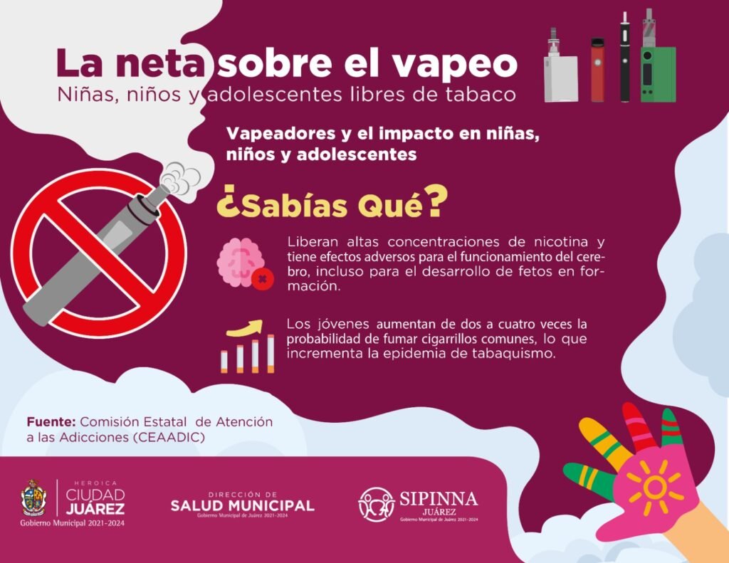 La Dirección de Salud del Gobierno Municipal busca concientizar a los padres de familia y jóvenes juarenses, sobre los peligros que con lleva el uso de cigarrillos electrónicos, conocidos como vapeadores.