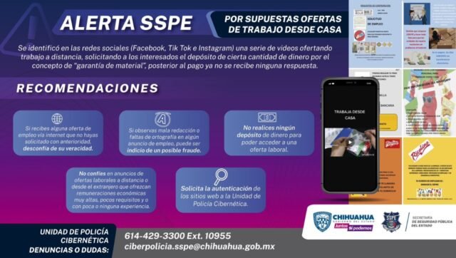 Finalmente, invitan a solicitar ayuda a la Unidad de la Policía Cibernética para autenticar los sitios web en el número de teléfono 614-429-3300 en la extensión 10955 y al correo ciberpolicia.sspe@chihuahua.gob.mx.