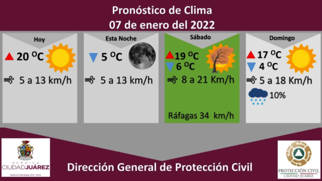Para el día de mañana sábado, se emite alerta verde por ráfagas de viento que alcanzarán los 34 kilómetros por hora, se espera una temperatura máxima de 19 grados centígrados, mientras que la mínima será de 6 grados celsius, con vientos de 8 a 21 kilómetros por hora durante el día.