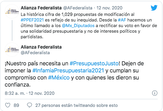 Dejen de imponer la Infamia Presupuestaria 2021 y cumplan su compromiso con México y con quienes les dieron su confianza: Alianza Federalista.