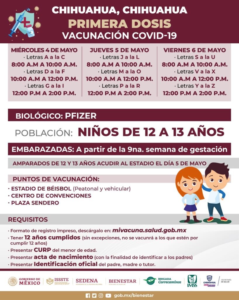La Secretaría de Bienestar dio a conocer que la Estrategia Estatal de Vacunación en Chihuahua continuará del 4 al 6 de mayo en la ciudad de Chihuahua.