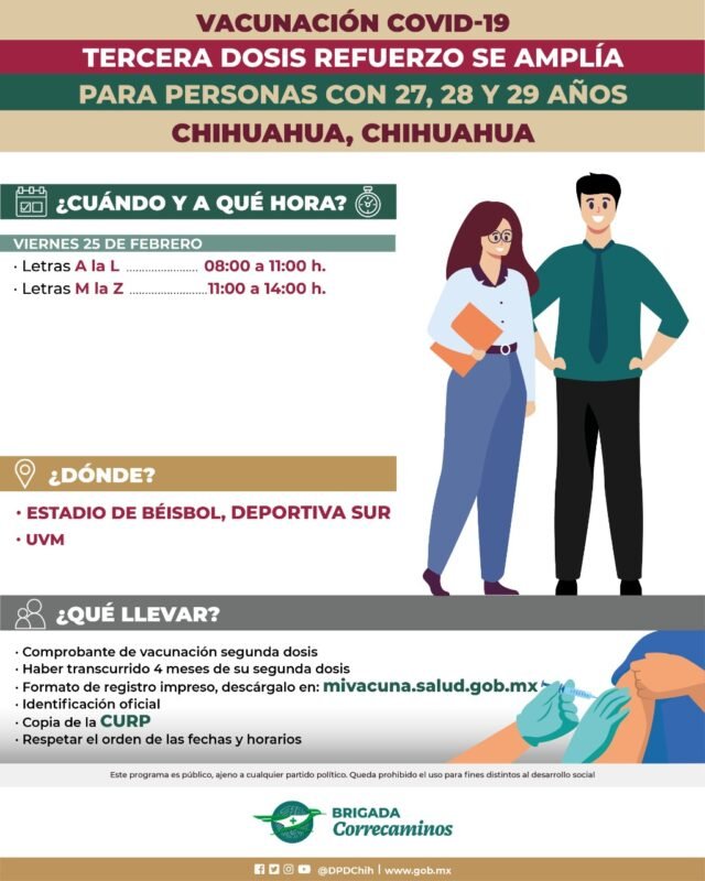 El operativo especial de vacunación de refuerzo para personas de 29 años se amplía para personas de 28 y 29 años, quienes también podrán acudir el día de mañana viernes 25 de febrero en un horario de las 8:00 a las 16:00 horas.