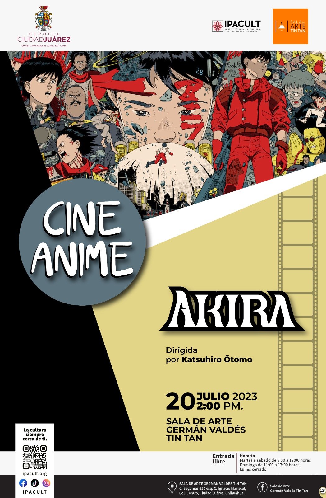 Este jueves 20 de julio, para seguir con el periodo de Cine de Anime, se proyectará la película “Akira”, en un horario de las 2:00 a las 4:00 de la tarde en la Sala de Arte Germán Valdés “Tin Tan”, ubicada en la calle Begonias número 620, en la colonia Bellavista.