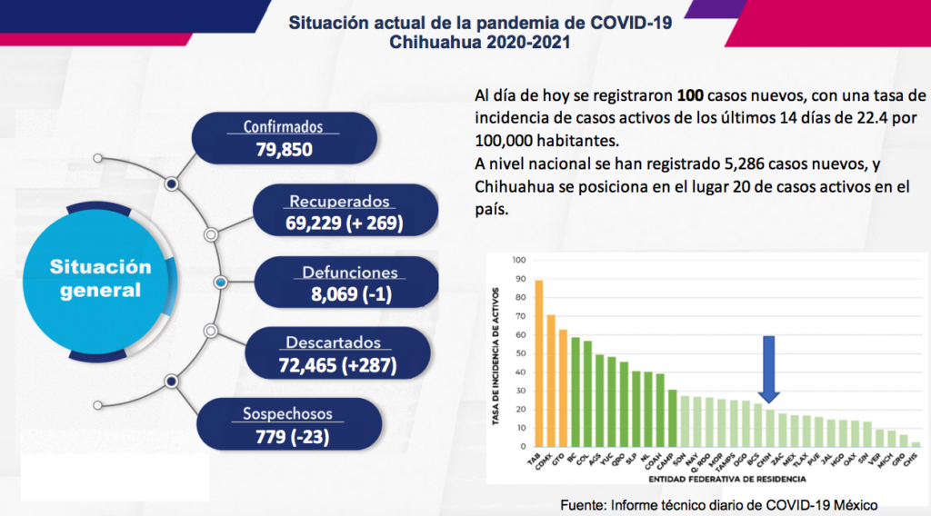 Este día se realizó un ajuste a los municipios que presentaban casos duplicados, por lo que se descontó un caso en Ojinaga, uno en Jiménez, 1 en Guazapares, 1 Namiquipa, 1 en Madera y 2 en Temósachic, lo que representa 8 casos menos de personas con COVID-19.