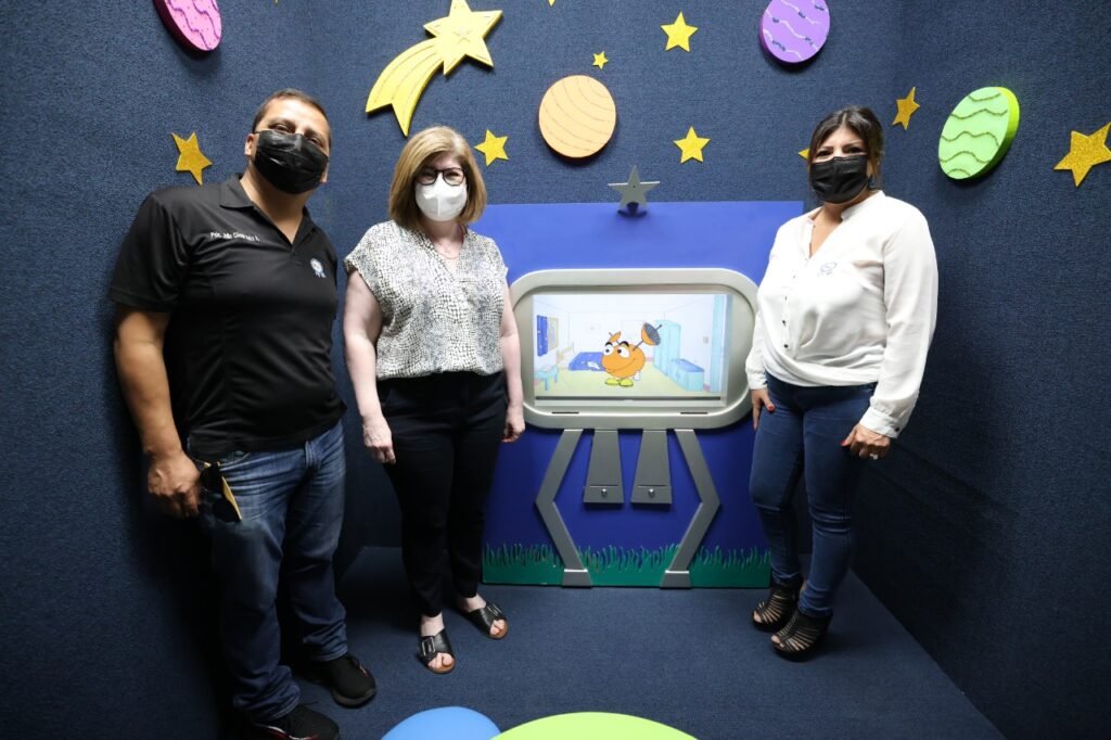 La directora General del Sistema de Desarrollo Integral de la Familia de Juárez, (DIF) Lucia Chavira, acompañada de la directora de Derechos de Niñas, Niños y Adolescentes, Teresa Vargas y del coordinador de los Centros de Atención Psicológica (CAP) visitaron las instalaciones de la Fiscalía de las Mujeres para conocer el funcionamiento del proyecto Antenas.