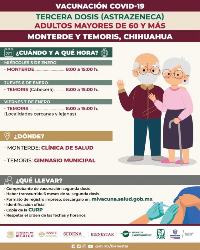 Asimismo, se llevará a cabo la aplicación de la tercera dosis de refuerzo para los adultos mayores en el municipio de Cuauhtémoc (Poliforo, Instituto Tecnológico, Técnica 69, Gimnasio Seccional Rubio y el Gimnasio Municipal Anáhuac), desde el miércoles 5 hasta el sábado 8 de enero. En Parral será en el Tecnológico de Parral y la Universidad Autónoma de Chihuahua, del martes 4 al jueves 6.