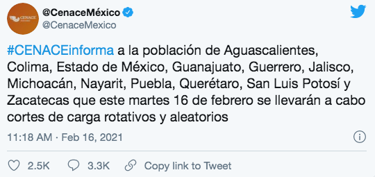 Luego de que ocurriera un apagón a gran escala en la zona norte del país, el Centro Nacional de Control de Energía (CENACE) anunció que el martes 16 de febrero, de 6:00 pm a 11:00 pm, “hará girar aleatoriamente la reducción de carga”. en los 12 estados del país Para evitar un mayor impacto en el sistema de interconexión nacional.