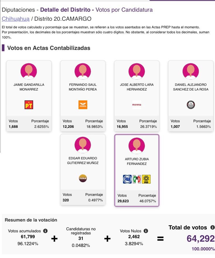 Distrito 20, en Camargo, a favor del candidato del PAN, PRI, PRD Arturo Zubia Fernández con 46 por ciento.