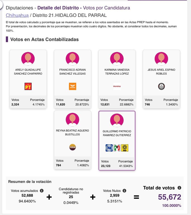 Distrito 21, en Parral, a favor del candidato del PAN, PRI, PRD Guillermo Patricio Ramírez con 41 por ciento.