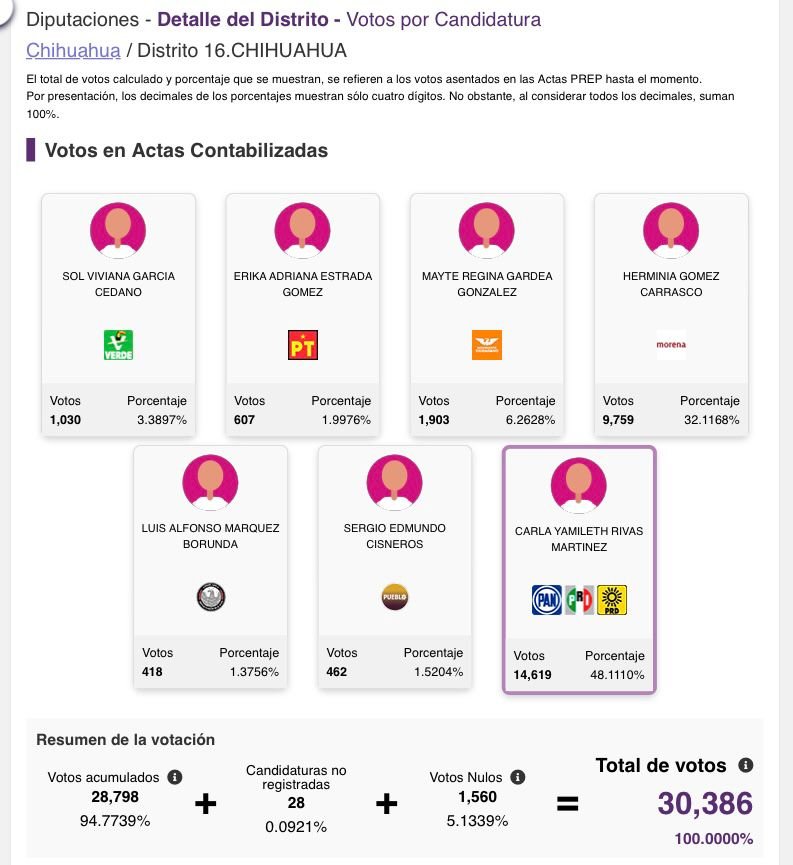 La situación es similar en el Distrito 16, en donde Carla Rivas aventaja a su contrincante con 43 por ciento.
