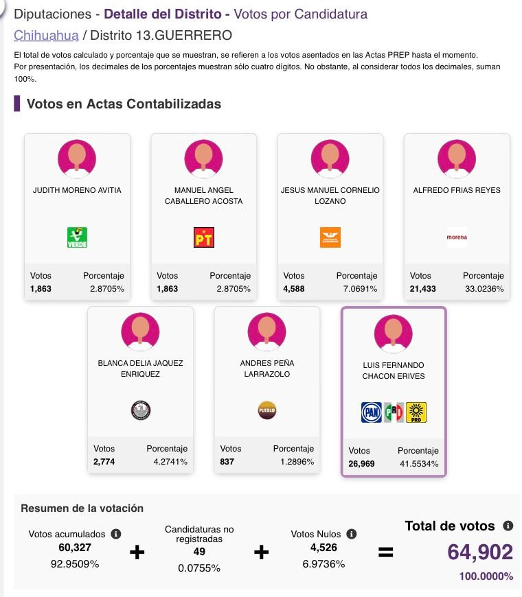 Distrito 13, en Guerrero, a favor del PAN, PRI, PRD Luis Fernando Chacón con 41 por ciento.