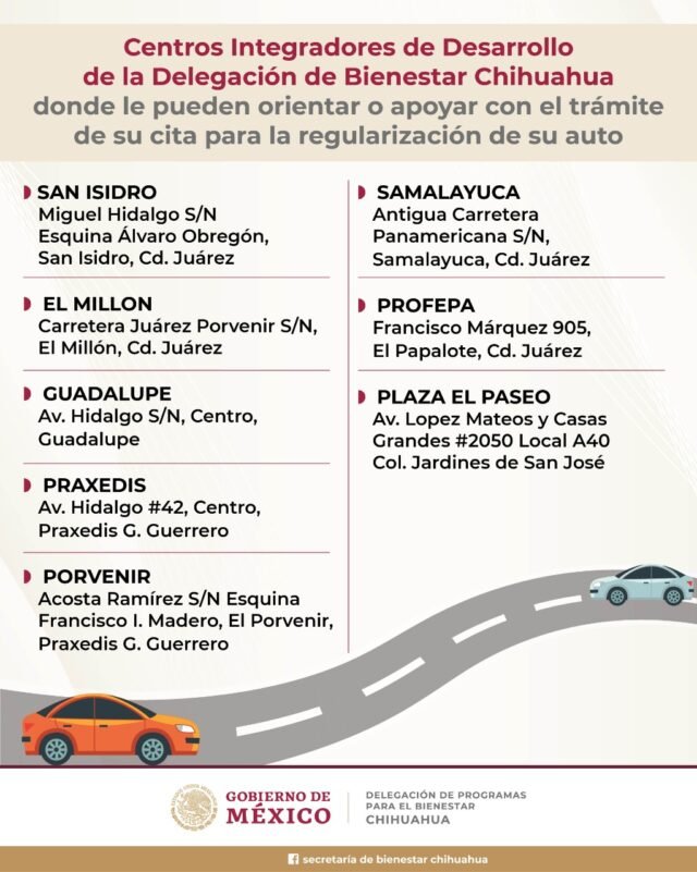 Los Centros Integradores de Desarrollo donde se pueden orientar o apoyar con el trámite de la cita para este proceso son el de San Isidro, ubicado Miguel Hidalgo sin número, esquina con Álvaro Obregón en San Isidro; El Centro Integrador Profepa de la calle Francisco Márquez 905, de la colonia El Papalote y el de de Plaza El Paseo, ubicado en la avenida Adolfo López Mateos y Casas Grandes 2050, local A40, de la colonia Jardines de San José; Así como el Centro Integrador Samalayuca en antigua carretera Panamericana sin número de Samalayuca. O bien se puede generar la cita via internet.
