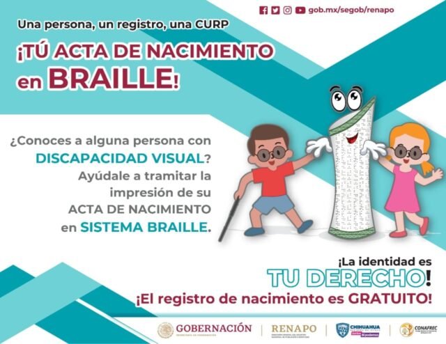 El director general del Registro Civil, Rafael Alejandro Corral Valverde, informó que el Registro Civil estará realizando la impresión gratuita de actas en sistema Braille hasta el 30 de diciembre en las oficialías Centro de Chihuahua Capital y Pueblito Mexicano en Ciudad Juárez.