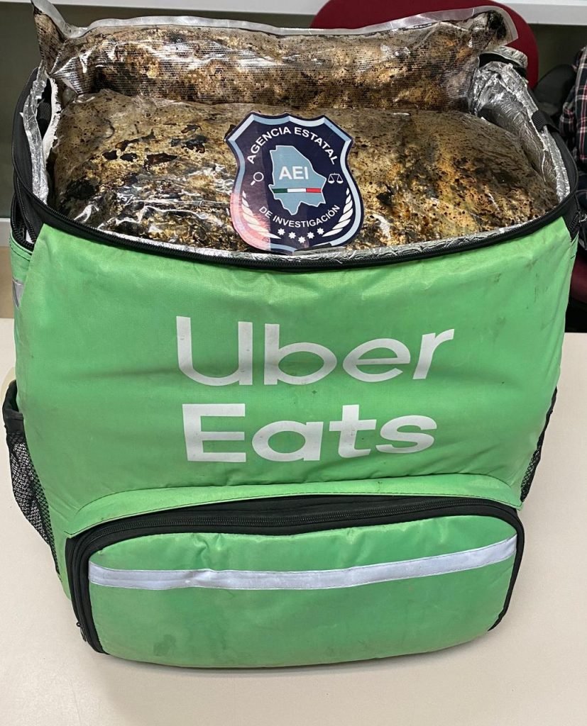 Durante la inspección a la mochila de color verde con la leyenda Uber Eats que traía, los agentes encontraron ocho paquetes que contenían el enervante, por lo que se le arresto.