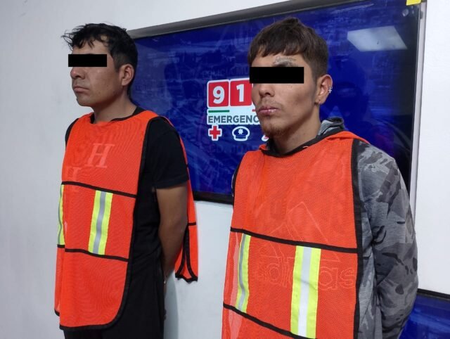 Agentes de la Secretaría de Seguridad Pública Municipal arrestaron a Edgar Patricio R. S. y Brandon Dialberto M. C., por su presunta responsabilidad en la comisión del delito de robo de vehículo con violencia y violación a la ley federal de armas de fuego y explosivos.