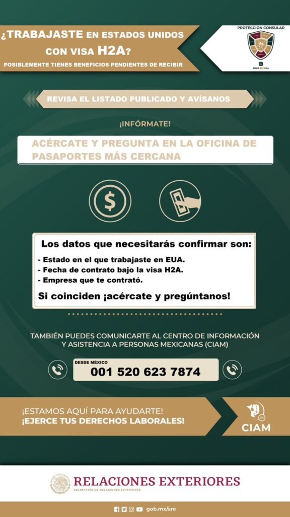 Trabajaste en Estados Unidos con Visa H2A,posiblemente tienes beneficios pendientes por recibir. Revisa el listado publicado y acércate a tu consulado. También, puedes comunicarte al Centro de Información y a Asistencia a Personas Mexicanas (CIAM) al 520-623-7874.