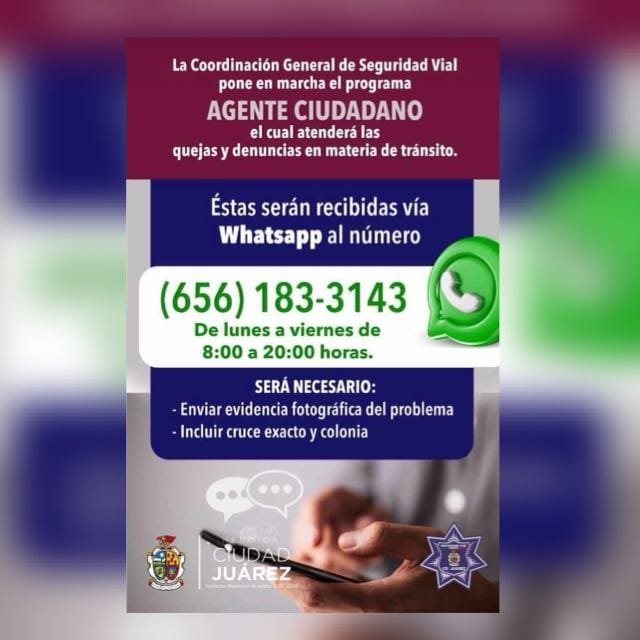 Con la finalidad de brindar una mejor atención, la Coordinación General de Seguridad Vial le recuerda a la ciudadanía que es a través de mensaje de texto como se atienden las quejas que llegan al número de whatsapp 656 183 3143 de Agente Ciudadano.