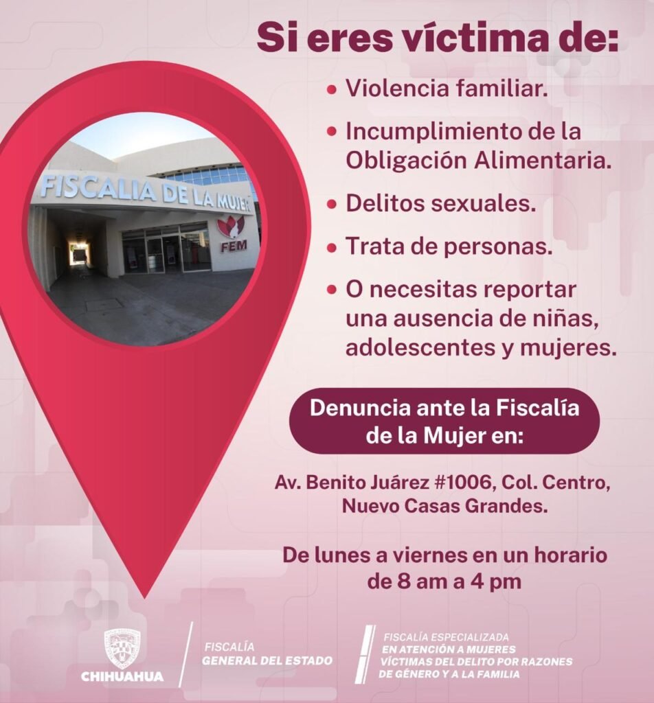 En caso de ser víctima de algún delito de género, acudir a la avenida Benito Juárez 1006, colonia Centro, en el municipio de Nuevo Casas Grandes, en un horario de lunes a viernes de 08:00 a 16:00 horas.