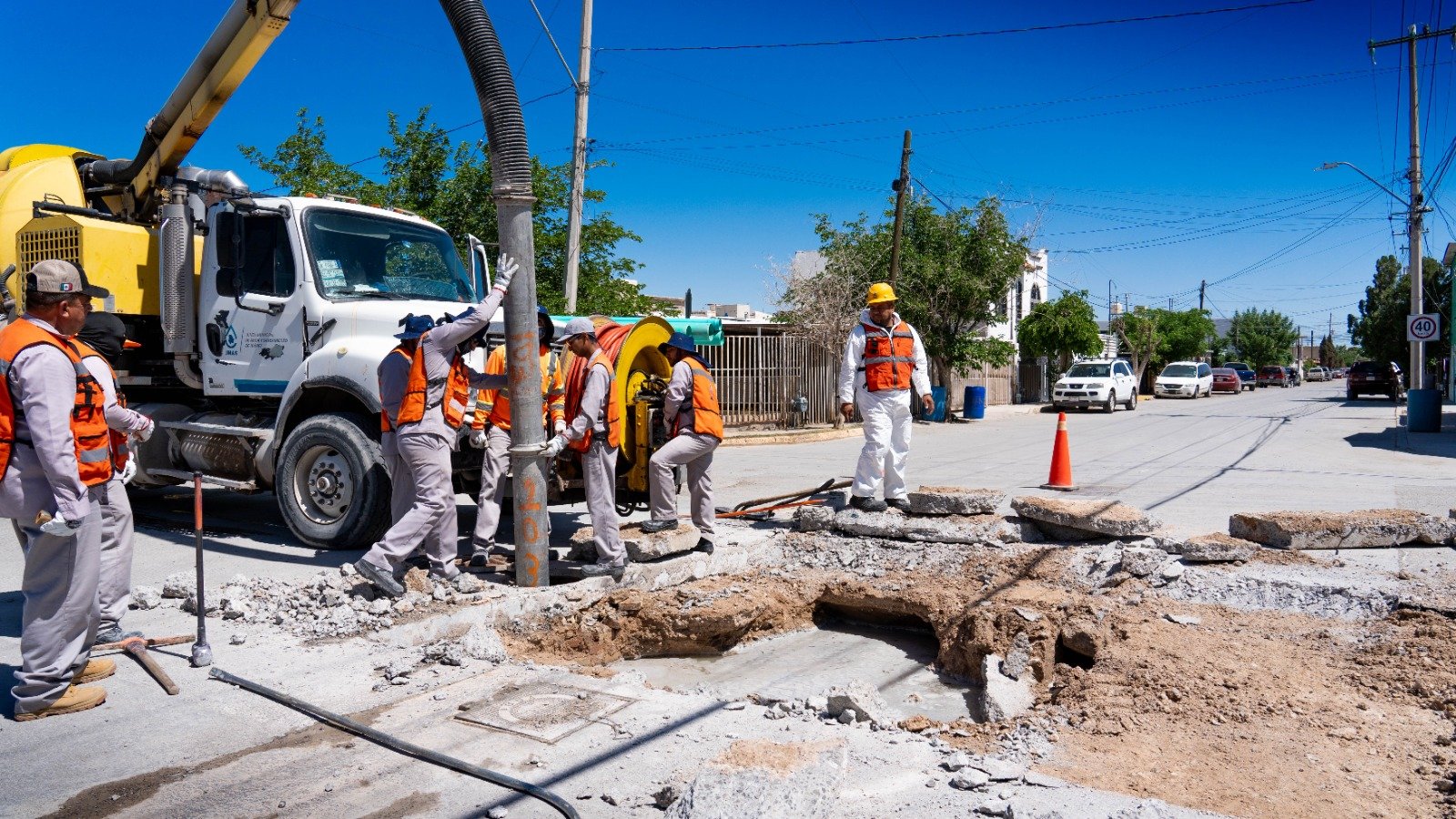 La Junta de Agua y Saneamiento de Juárez, a través del departamento de alcantarillado, trabaja en la reparación de un hundimiento registrado en el cruce de las calles Aviación y Hangar, en el fraccionamiento Jardines del Aeropuerto.