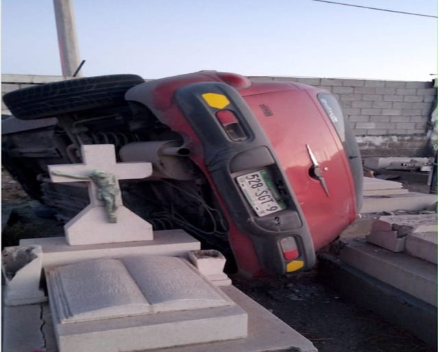 De acuerdo con los reportes, el accidente vehicular ocurrió en Municipio Libre y calle Rosales, cuando un automóvil PT Cruiser 2001 quedó en el interior de un cementerio del sector.