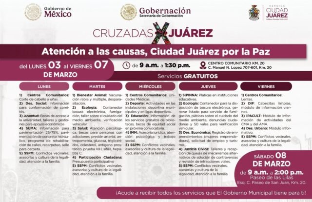 El próximo sábado 8 de marzo, de 9:00 de la mañana a 2:00 de la tarde, se va a llevar a cabo la segunda Cruzada por Juárez “Atención a las causas, Juárez por la Paz”, en el parque de la colonia Kilómetro 20, situado en Paseo de las Lilas, esquina con calle Paseo de San Juan.