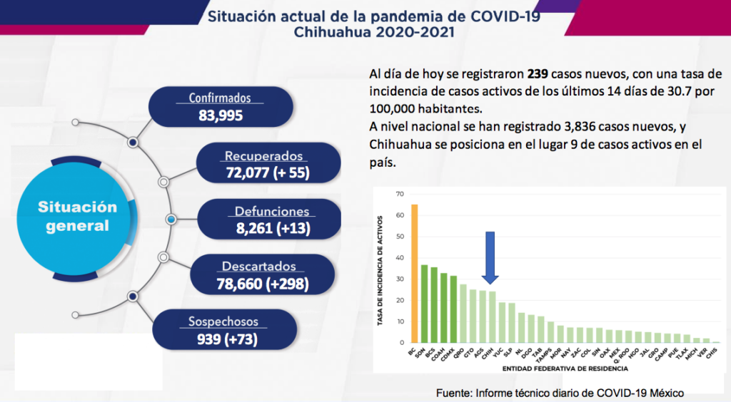 El Gobierno del Estado, a través de la Secretaría de Salud de Chihuahua, presenta este 19 de noviembre el reporte COVID-19, en el cual se registran 83 mil 995 (+239) personas confirmadas en la entidad por este padecimiento, 72 mil 077 (+55) casos recuperados, 78 mil 660 (+298) descartados y 939 (+73) casos sospechosos.