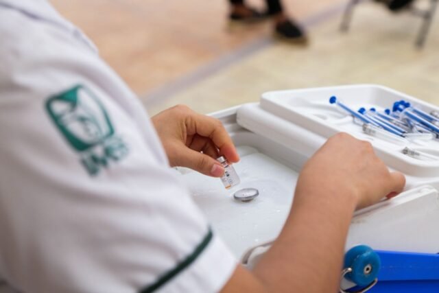 En Baja California Sur, el Seguro Social participa con cinco células de vacunación para la aplicación del biológico a menores entre cinco a 11 años de edad en la Arena “La Paz”, ubicada en la capital del estado.