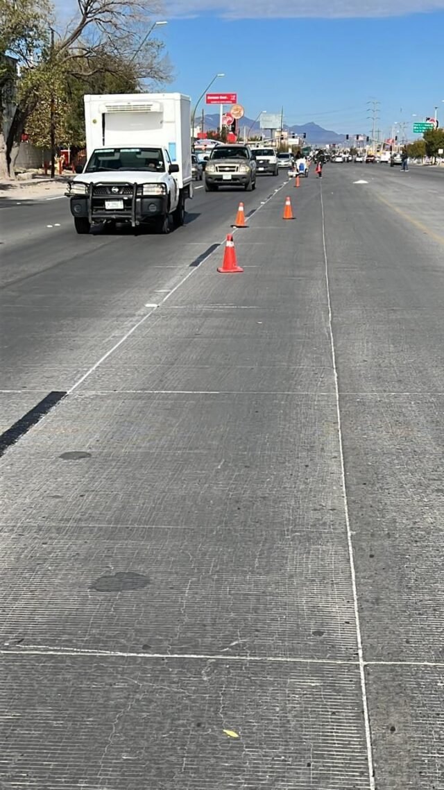 Las labores de aplicación de pintura termoplástica para delimitar los carriles de circulación vehicular, sobre el trayecto vial mencionado, se realizaron en el tramo comprendido entre la avenida Manuel J. Clouthier y la calle Tlaxcala.