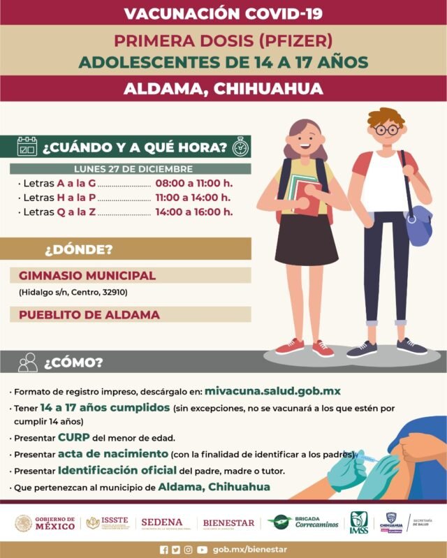 El punto de vacunación en Aldama es el Gimnasio Municipal, ubicado en el Centro, en la calle Hidalgo s/n, C.P. 32910, de las 8:00 am a las 4:00 pm. Para evitar desórdenes, se ha programado que los jóvenes acudan en horarios diferentes, dependiendo de la letra inicial de su primer apellido.