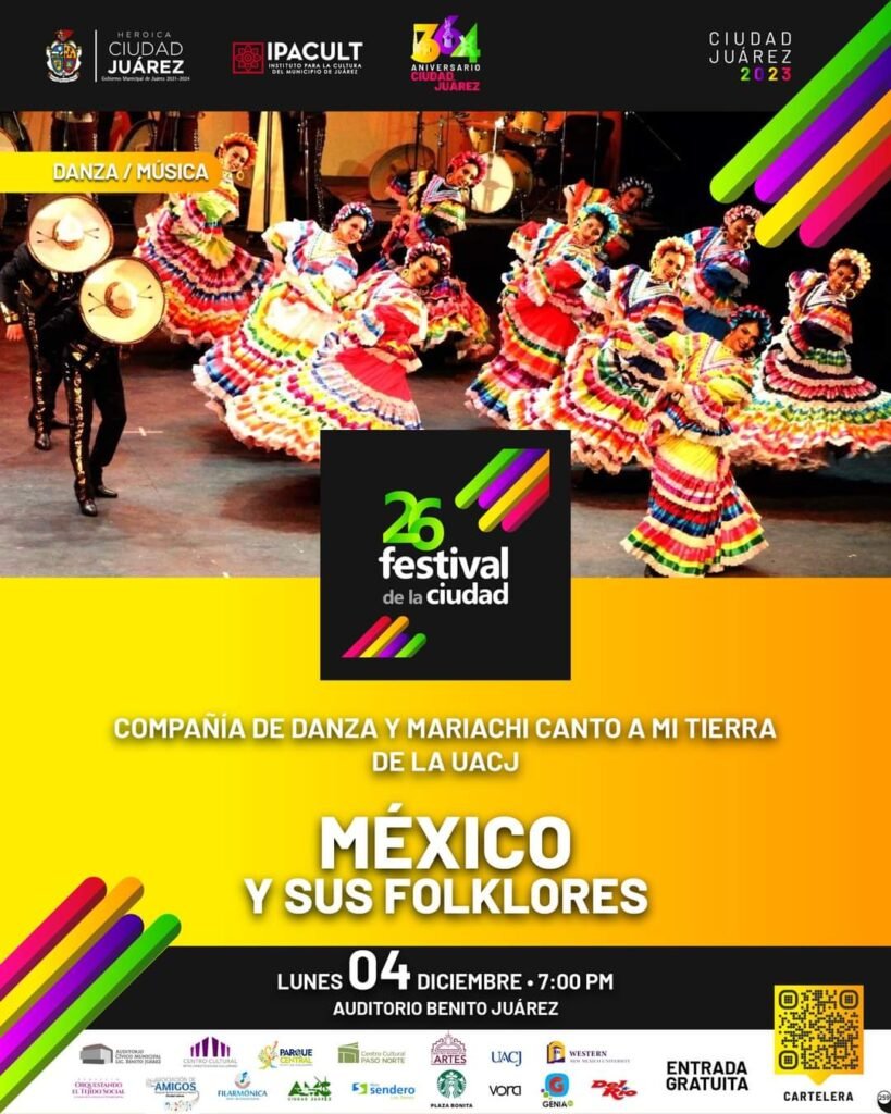 Para hoy 4 de diciembre se espera a la Compañía de Danza Folklórica y al mariachi Canto a mi Tierra, ambos de la Universidad Autónoma de Ciudad Juárez (UACJ), los cuales ofrecerán México y sus folklores. El punto de reunión es en el Auditorio Benito Juárez a las 7:00 de la tarde