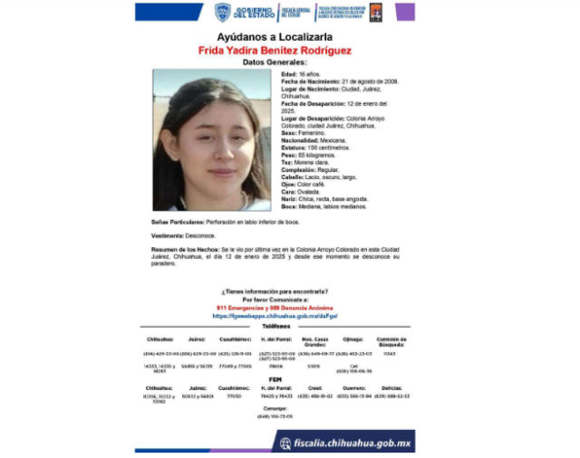 Autoridades y familiares solicitan la ayuda de la comunidad para encontrar a Frida Yadira Benítez Rodríguez, una joven de 16 años que desapareció el 12 de enero de 2025 en Ciudad Juárez.