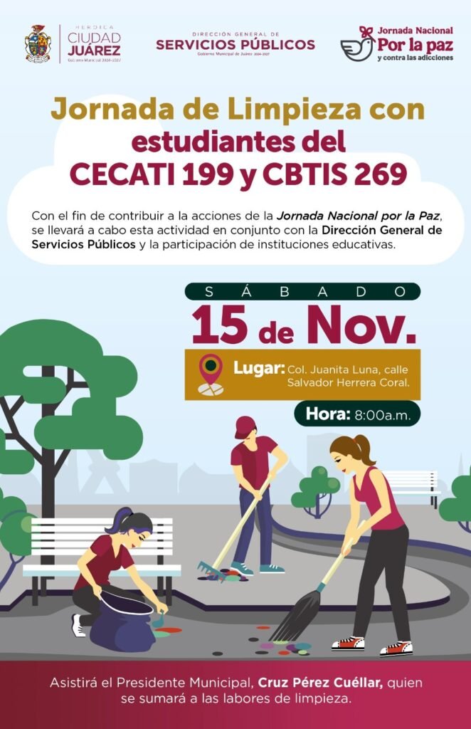 Mañana sábado 15 de noviembre, a las 8:00 de la mañana, se llevará a cabo una Jornada de Limpieza en la calle Salvador Herrera Corral, de la colonia Juanita Luna, con la participación de alumnos del CECATI 199 y del CBTIS 269, en coordinación con la Dirección de Limpia, como parte de las acciones de la Jornada Nacional por la Paz.