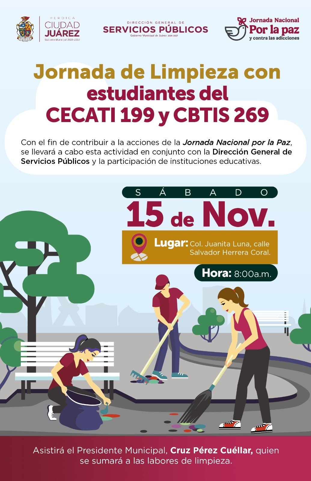 Mañana sábado 15 de noviembre, a las 8:00 de la mañana, se llevará a cabo una Jornada de Limpieza en la calle Salvador Herrera Corral, de la colonia Juanita Luna, con la participación de alumnos del CECATI 199 y del CBTIS 269, en coordinación con la Dirección de Limpia, como parte de las acciones de la Jornada Nacional por la Paz.