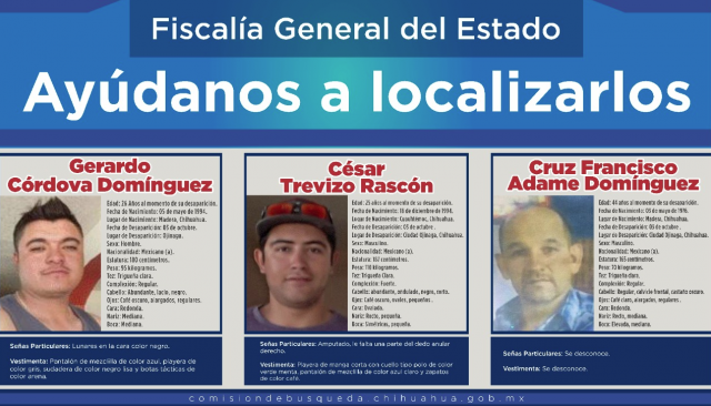La Agencia del Ministerio Público de la Fiscalía de Distrito Zona Centro en el municipio de Ojinaga, en coordinación con policías investigadores y peritos, intensificó las acciones de búsqueda para localizar tres personas identificadas como César Trevizo Rascón, Cruz Francisco Adame Domínguez y Gerardo Córdova Domínguez, quienes se contactaron por última vez con sus familiares el 3 de octubre del año 2020.